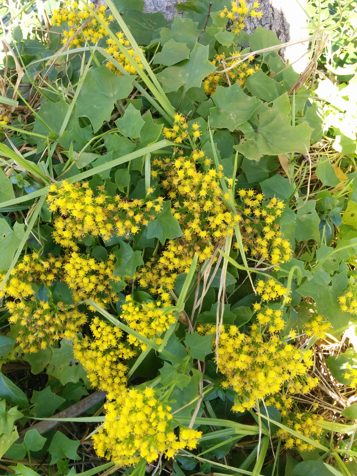 Cape ivy is a climbing vine or creeping groundcover with slightly fleshy stems and leaves. The leaves are bright green, somewhat fleshy, and lobed so that they resemble ivy leaves. The stems are often purplish when young, and rather weak, eventually become woody when mature. The small yellow flower-heads are borne in dense clusters in the leaf forks or at the tips of the branches. Flowering occurs mainly during winter and spring.